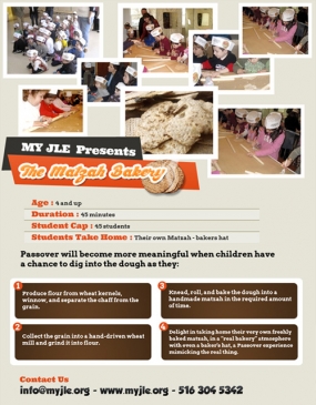 Delight in taking home their very own freshly baked matzah, in a “real bakery” atmosphere with even a baker's hat, a Passover experience mimicking the real thing.