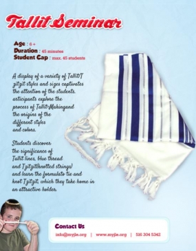 A display of a variety of Tallit/Tzitzit styles and sizes captivates the attention of the students. Participants explore the process of Tallit-Making and the origins of the different styles and colors. Students discover the significance of Tallit lines, blue thread and Tzitzit (knotted strings) and learn the formula to tie and knot Tzitzit, which they take home in an attractive holder.